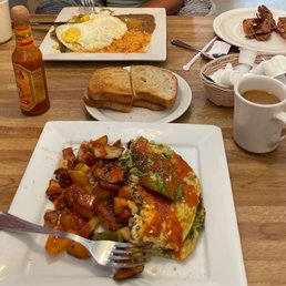 We had recently stayed down in the Santa Ana area and were looking for a breakfast place. Luckily , I had spotted this little place way to try to find donuts. It seemed to be packed in the parking lot and it was only 7:45am on a Sunday. I went ahead to check out on my trusty Yelp App and it had really good reviews. As Samantha Brown said"If i it of has a long line, it's worth the wait". From the Travel channel. I had walked in without a reservation at 10 and there was a minimal wait. The dishes and breakfast had a comfort food vibe and huge portions. I had ordered a John Wayne scramble/ skillet with Jack cheese, 3 eggs over medium with peppers, potatoes and country sausages on the side. It was topped with a red sauce and served with tortillas ( corn). I had also ordered a hot chocolate minus the whipped cream. The servers and staff are very attentive and also super friendly. My wifeys Chiliquedas looked good and it was priced moderately for a family of 4. Definitely glad I had stopped by and might get lunch next time around because the menu seemed diverse and hearty portions make it family friendly prices.
